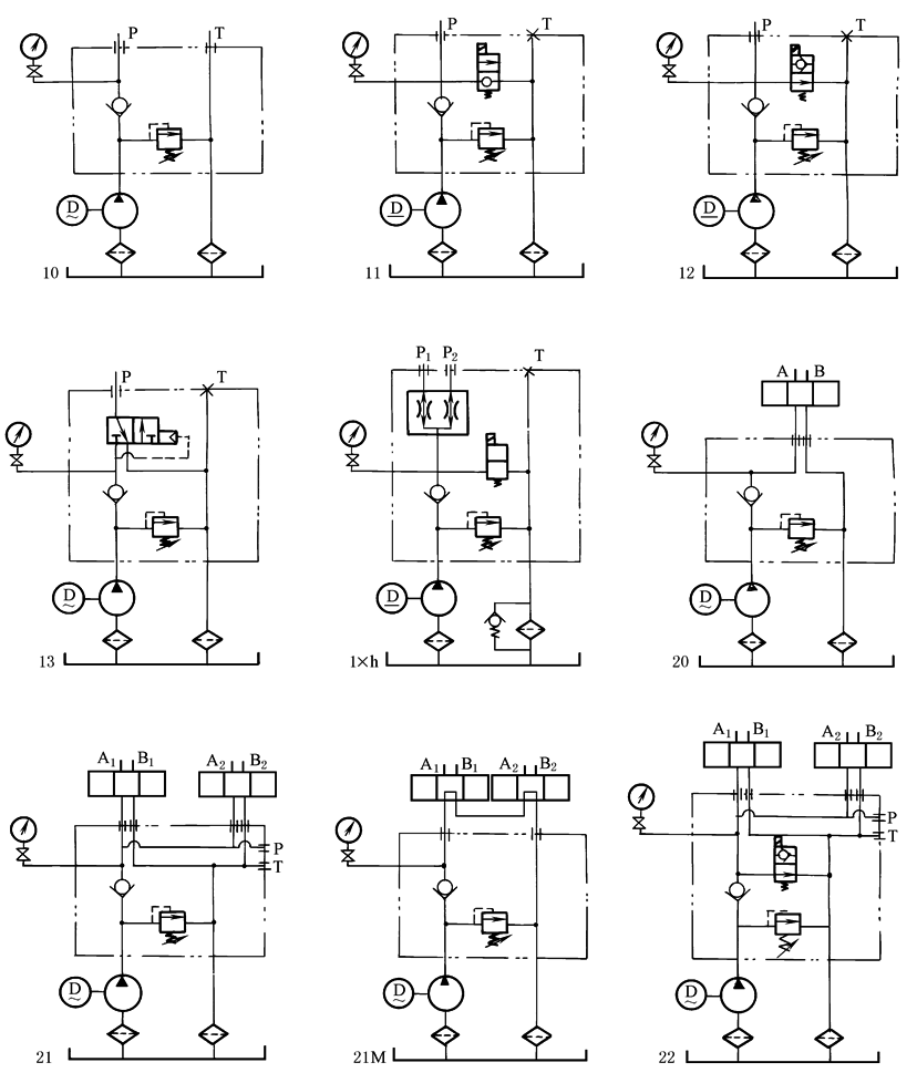 注:1.1.1×h回路同步阀h可安装在11、12、13回路中,成为11h、12h或13h回路。 2.21、22回路可并联多个板式换向阀,不能选用M、H型机能阀。 3.20、21、21M、22回路各换向阀还可叠加各种功能阀。 4.将21M回路中的一个阀换成H型机能阀时,成为21MH回路,如两个阀都换成H型机能阀时,则成为21H回路。 5.回路工作原理参见UP液压动力包的表 |