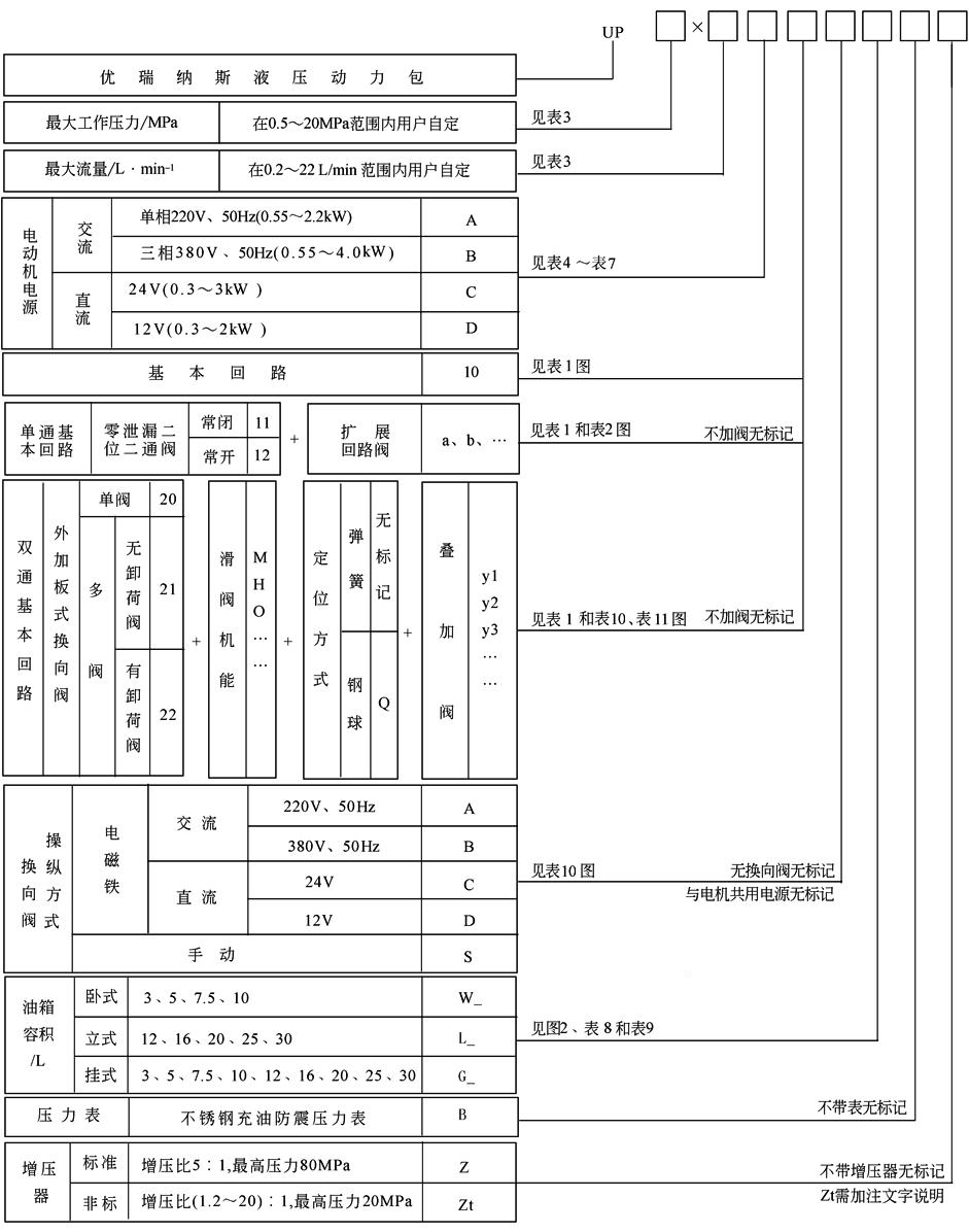 UP液压动力包UP系列液压动力包(以下简称UP液压包)是一种用螺纹插装阀块把电动机、泵、阀、油箱紧凑地连接在一起的微型液压动力源。与同规格的常规液压站相比,结构紧凑,体积小,重量轻。UP液压包作为小型液压缸,液压马达的动力源,现已广泛应用于我国的工程机械、医疗、环保、液压机具、升降平台、自动化设备等行业 UP液压包最高工作压力25MPa;流量范围0.22~22L/min;有交流单相220V、三相380V,直流24V和12V共4种电源几十种规格的电动机;有6种标准回路和可以自由扩展的多种回路;有卧式、立式、挂式三种安装方式;油箱容积3~30L,9种规格的油箱;增压器最高输出压力200MPa。 液压包的核心是一个150mm×150mm×50mm的矩形插装阀块。在阀块的两个150mm×150mm大平面上一端固定着电动机,另一端固定着齿轮泵和油箱,电动机通过联轴器带动齿轮泵,齿轮泵输出的压力油从油泵前盖出油口直接进入阀块。溢流阀、单向阀、换向阀等都直接插装在阀块侧面上,通过阀块内部油道相连,进出油口P、T,板式阀座孔P、T、A、B,压力表接口G,固定安装孔也都开在阀块的侧面上。吸油滤油器固定在油泵后盖的吸油口上。油泵、滤油器被封闭在油箱内,油箱有加油口和放油口。UP液压包由天津优瑞纳斯油缸有限公司生产 (1) 型号意义