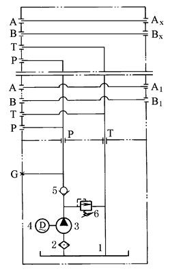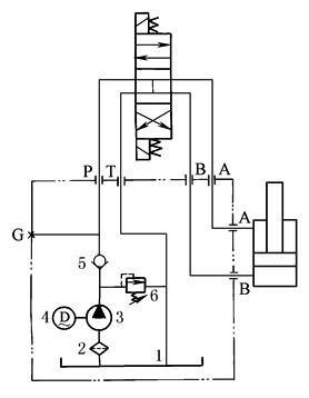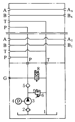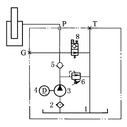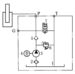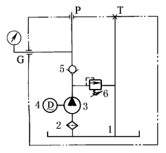 基本型回路。常作为外接阀组的液压源,也可直接带动单向液压马达 电动机4带动齿轮泵3转动,经过网式滤油器2过滤后,将油箱1中的工作介质吸入泵内。被齿轮泵增压的工作介质经单向阀5从压力油口(P口)输出。经用户外接阀组到执行元件,如液压马达液压缸等,工作后的介质,经回油口(T口)返回油箱。6是可调节的螺纹插装溢流阀,用于调定系统压力。当执行元件工作压力达到溢流阀调定的额定压力时,压力介质会从溢流阀返回油箱,使系统压力保持在额定压力调定值,不再升高,起到安全保护作用。当齿轮泵停止工作时,螺纹插装单向阀5防止执行元件内的压力介质经泵和溢流阀返回油箱,起到保压和保护泵的双重作用 |