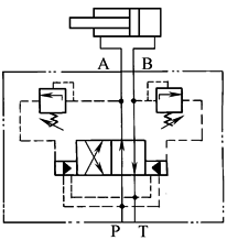单作用常闭式基本型回路。是在10回路基础上增加了一个无泄漏的常闭式螺纹插装二通电磁换向阀7。本回路适用于短时间工作,较长时间保压的工况,例如举升重物用单作用液压缸。电机带负载启动,液压缸举升动作完成后即关闭电机。由于回路中采用的是无泄漏常闭式螺纹插装二通阀和单向阀,所以只要液压缸和管道无泄漏,柱塞就不会出现沉降。在需要柱塞下降时,只要使二通阀换向,就可使液压缸内工作介质经二通阀流回油箱,使柱塞复位。二通阀换向可选择电动,也可选择手动,或者电动带手动调整。在阀块的侧面,压力油口P旁开有备用回油口T,当双作用缸只使用一腔工作时,该油口可作为另一腔的泄漏油口或呼吸油口 |