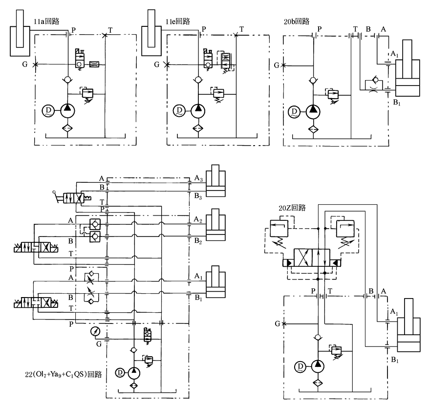 在阀块上插装各种液压阀或串联各种管式阀、板式阀,可以组成多种扩展回路,见下图。例如:11a回路可以实现重载荷柱塞缸的慢速下降。常用于载荷不变或变化较小的工况。插装恒速阀的11e回路,在工作载荷范围内,无论载荷怎样变化,都能确保柱塞缸的下降速度不变。常作为叉车的货物升降回路