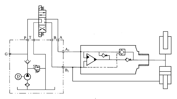 液压包用二位或三位四通换向阀向增压器供油,经增压器增压后,连续输出高压油。常用于柱塞缸、弹簧复位缸和单腔高压的双作用缸,其原理图见图1。标准增压器比为5∶1,输出流量是输入流量的10%,最高输出压力为80MPa。非标增压器有11种增压比,从1.2∶1到20∶1;最大输入/输出流量为70/9L/min;最高输出压力为200MPa;还可提供双路增压器,用于两腔都需高压油的双作用液压缸 增压器的优点:输出压力可调;连续输出压力介质;带无泄漏液控单向阀;常压时由初级回路直接供油,高压时才由增压器供油,既可提高效率,又能节省能源;由于采用初级常压回路控制,因此故障率极小,性能可靠,使用寿命长