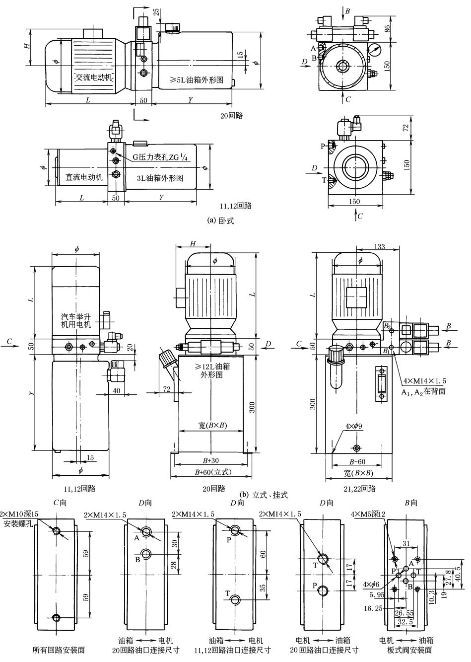 液压包的安装方式有卧式、立式和挂式三种 卧式液压包(W)是用阀块将电机和油箱左右连接在一起。安装时用阀块C向侧面的2个M10深15mm的安装螺孔将其固定。卧式油箱有3L、5L、7.5L和10L四种容积 立式液压包(L)是用阀块将电机和油箱上下连接在一起,安装时用油箱底脚的4个f 9mm通孔将其固定。立式油箱有12L、16L、20L、25L、30L5种容积。不随机移动的立式液压包也可直接放置在平整的地板上 挂式液压包(G)是利用阀块C向侧面的2个M10深15mm的安装螺孔将卧式和立式液压包悬挂起来的安装型式。卧挂式油箱是将卧式油箱直油口更换成90°油口,使油箱油口保持向上,并高于油液平面;立挂式油箱是立式油箱不带安装底脚。其余外形及尺寸与卧式和立式完全相同 参照液压原理图,用清洁的管路、接头把液压包油口与执行元件正确连接起来