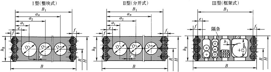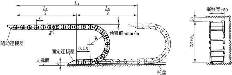 3) 根据拖链功能要求,确定支撑板型式和拖链的弯曲半径:当拖链需承载较大管缆载荷时,应选用高强度支撑板Ⅰ型;当管路的管接头尺寸大于支撑板孔径或需经常拆装、维修等时,可选用支撑板Ⅱ型;安装管缆的规格品种较多时,可选用支撑板Ⅲ型 4) 确定支撑板宽度B1和拖链宽度B B1=2e+n1D1+n2D2+…+(n-1)C 式中 D1,D2…——孔径; n1、n2…——对应孔径的孔数; n——总孔数; e、C——查表2; B=B1+2f 式中 f——查表2 5) 确定拖链长度:由工作机械的移动行程Ls确定拖链的长度L
