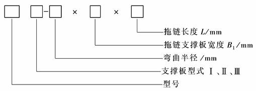 标记示例: 拖链型号TL95,支撑板Ⅲ型,弯曲半径R=250mm,支撑板宽度B1=300mm,拖链长度L=3325mm,记为: 拖链TL95 Ⅲ-250×300×3325(订货时需附支撑板上开孔配置图) 选择计算: 1) 支撑板最大孔径:D1=1.1d(取整数),d——管缆最大外径。 2) 选择拖链型号:由支撑板最大孔径D1,按表1选择型号 |