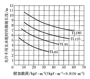 图2 允许不用支承轮时的 拖链长度与附加载荷关系 |