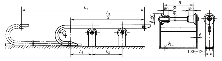 计算后,按节距圆整,L=Zt,Z为节数,t为节距 要注意,液压管在压力下会伸长或缩短,确定拖链长度时应计及软管的这一弹性因素 6) 校核拖链长度:允许不用支承轮时的长度与附加载荷的关系如图2。如果拖链长度超出允许不用支承轮的长度时,建议在拖链下面加支承滚轮等,以免拖链下沉并保证拖链有最佳的移动性能。由用户自制的支承滚轮见图3。