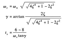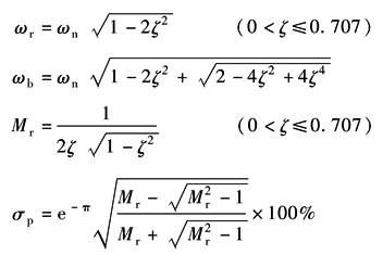 频域指标与时域指标的换算关系如图2所示 利用上述公式或关系曲线来确定闭环系统的过渡过程的品质时可按以下步骤来进行: ① 根据开环波德图或闭环波德图确定频域指标穿越频率ωc、相位裕量γ或谐振峰值Mr、截止频率ωb和谐振频率ωr; ② 根据γ或Mr求取系统的阻尼比ζ; ③ 根据γ或Mr求取系统瞬态响应的超调量σp; ④ 由阻尼比ζ和ωc/ωn或ωr/ωn或ωb/ωn求取系统的无阻尼自然角频率ωn; ⑤ 根据公式或关系曲线求取系统调整时间ts