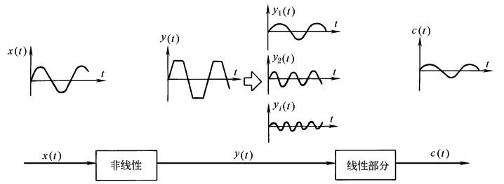 若非线性特性是斜对称的,则A0=0。若线性部分具有较好的低通滤波特性,则线性部分的输出主要由y(t)中的基波分量决定。因此对于整个系统而言,分析非线性元件的输入信号x(t)和线性部分输出C(t)之间的关系时,可以近似以y(t)中的基波分量y1(t)作为非线性元件的整个输出量,即