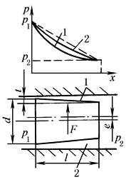 αL——侧向力系数;t/c=0.9时,αLmax=0.27 d——滑阀凸肩直径,m l——滑阀凸肩宽度,m p1,p2——凸肩两侧压力,Pa t——侧压时大端的最小间隙,m c——阀芯处于中心时大端处的径向间隙,m e——阀芯与阀套的偏心距,m 减弱措施: (1)控制锥度使t/c=1,减少侧向力;(2)在阀芯两端支承凸肩上开3~5条环形槽,可显著减少侧向力;(3)提高过滤精度,减少因杂质造成的卡住现象 |