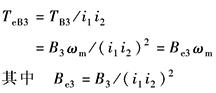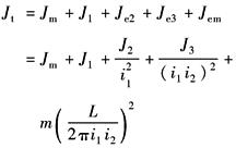 J1,J2,J3——1,2,3轴的转动惯量,N·m·s2/rad ω1,ω2,ω3——1,2,3轴的角速度,rad/s G1,G2,G3——1,2,3轴的扭转刚度,N·m/rad i1,i2——两齿轮对的减速比 Jm,Tm,ωm,Bm——液压马达的转动惯量、转矩(N·m)、转速及黏性阻尼系数(N·m·s/rad) L,d——滚珠丝杠的螺距、直径,m m,BL,FL,υ——工作台的惯量(kg)、黏性阻尼系数、负载力(N)及转速(m/s) |