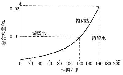 (1)溶解水:当油液中含水量低于饱和度时,水以溶解态存在于油液中 (2)游离水:当油液中含水量超过饱和度时,过量的水以水珠状悬浮在油液中,或以自由状态沉淀在油液底部。油液暴露在潮湿环境下,或与水接触,其吸水量大约经过8周可达饱和,油液的含水饱和度与油液的类型、黏度及油温有关,如图所示 常用油的含水饱和度: 液压油 0.02%~0.04% 润滑油 0.02%~0.075% 变压器油 0.003%~0.005% |