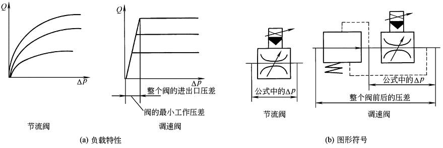 图1 节流阀与调速阀负载特性、图形符号