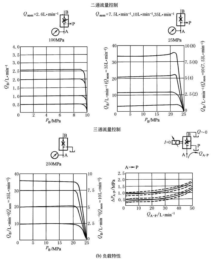 流量阀是指在节流阀基础上,配置或压力补偿、或负载适应、或流量检测反馈的控制阀,其输出受控参数是通过阀的流量。图1给出了节流阀与调速阀(以压力补偿型为例)的负载特性、图形符号以及流量公式的对比。注意两种阀的流量公式、负载特性压差坐标中Δp的差别。流量公式为: