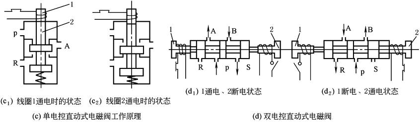 1—电磁铁;2—阀芯 直动式电磁阀是利用电磁力直接推动阀杆(阀芯)换向。根据阀芯复位的控制方式,有单电控和双电控两种,图c所示为单电控直动式电磁阀工作原理图。图c1所示电磁线圈未通电时,P、A断开,阀没有输出。图c2所示电磁线圈通电时,电磁铁推动阀芯向下移动,使P→A接通,阀有输出 图d所示为双电控直动式电磁阀工作原理图,图d1所示电磁铁1通电,电磁铁2为断电状态,阀芯3被推至右侧,A口有输出,B口排气。若电磁铁1断电,阀芯位置不变,仍为A口有输出,B口排气,即阀具有记忆功能,图d2所示为电磁铁1断电、电磁铁2通电状态,阀芯被推至左侧,B口有输出,A口排气。同样,电磁铁2断电时,阀的输出状态保持不变 直动式电磁阀特点是结构简单、紧凑、换向频率高。但用于交流电磁铁时,如果阀杆卡死就有烧坏线圈的可能。阀杆的换向行程受电磁铁吸合行程的限制,因此只适用于小型阀。通常将直动式电磁阀称为电磁先导阀 |