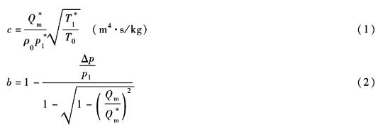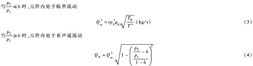图a所示为ISO6358标准测试元件流量性能的回路,其中图a1适用于被测元件具有出入接口的试验回路,图a2适用于元件出口直接通大气的试验回路。测试时,只要测定临界状态下气流达到的p*1、T*1和Q*m以及任一状态下元件的上游压力p1以及通过元件的压力降Δp和流量Qm,分别代入式(1)和式(2)可算出c值和b值。若已知元件的c和b参数,可按式3和式4计算通过元件的流量 国际标准ISO 6358气动元件流量特性中,用声速流导c和临界压力比b来表示方向控制阀的流量特性。参数c、b分别按下式计算