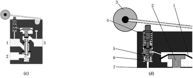 图c是先导式二位三通常闭型机控阀的工作原理示意图,该阀的工作原理与直动式二位三通不同的部分见图d先导阀部分,当滚轮未被压下时,来自先导气源通道的压缩空气(来自于工作气源口1),在弹簧力的作用下,由密封垫把阀口封死,当滚轮被压下时,先导阀杆下移,推开密封垫,先导气源通道的压缩空气与先导室导通,压缩空气作用在先导室膜片产生大的推力推动先导活塞,先导活塞下移。先导活塞的密封件封死主阀阀芯的中间通孔(关闭输出口2与排气口3的通路见图c),并使主阀阀芯克服弹簧力后继续下移,被空心阀芯杆密封件封死的阀口被打开,气源工作口1与输出口2导通。先导式二位三通机控阀可使机械控制滚轮的驱动力在6bar时仅1.8N,该阀流量为120L/min |