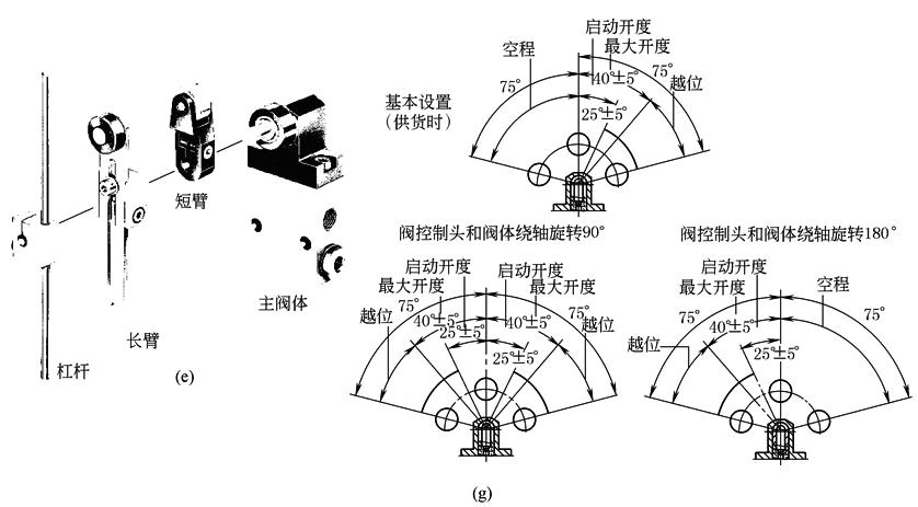 旋转杠杆式机控阀由主阀体与机械操作机构两大部件组成,见图e。它的机械驱动部件根据需要可配置杠杆型(有些气动厂商亦称可调杆式)、长臂型、短臂型(图f)。短臂型驱动力为7N,长臂型、杠杆型驱动力低于7N(根据调整后长度,驱动力会有不同),主阀体上转动控制头可调整驱动范围(见图g) |