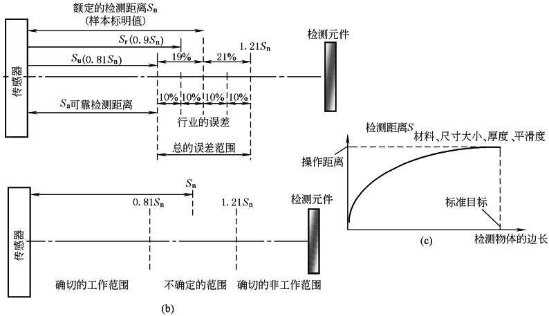 ①额定检测距离Sn:其特性值是不考虑制造公差或由温度或电压引起的偏差,如图b所示 ②实际检测距离Sr:实际检测距离指在额定电压与23℃±5℃环境温度下的检测距离,与额定检测距离的偏差最大为±10%,如图b所示 ③有效检测距离Su:是需考虑在指定范围内由电压和温度波动引起的偏差,它与实际检测距离可存在最大±10%偏差,如图b所示 ④可靠检测距离Sa:制造商承诺可靠检测距离适用于所有指定的工作条件。它为可靠设计提供了基础。在允许的工作条件下的检测距离,在以0到最小有效检测距离间取值,如图b所示 样本列出的检测距离是基于标准的检测物件的大小,如果是检测其他的目标(大多数的应用),实际的检测距离会有所不同,以下因素会影响到检测距离:材料、尺寸大小、厚度、平滑度,如图c所示