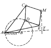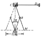 AB=BC=BM 如C处用滑块,轨迹点M作直线运动。如用CD杆代替滑块,M点作近似直线运动。如CD长度等于输出行程,则M点的直线轨迹误差为0.03%,2α最大值为40° |