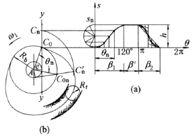 h,β1,β',β2,e,Rb,从动件运动规律及凸轮转向(图中为逆时针向) |