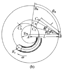 任选凸轮转动轴心A,按结构布局取定从动件转轴B的位置(AB=L),分别以A和B为圆心,以Rb和l 为半径作弧相交于C0点(有二点,按需要取一点),则BC0为从动件起始位置,并标出凸轮转向 |