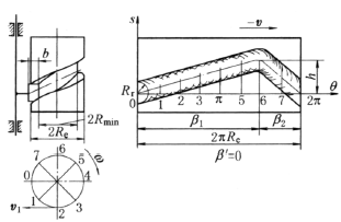 h,β1,β',β2,滚子宽度b,凸轮最小半径Rmin,外圆半径Re=Rmin+b+(1~3)mm,从动件运动规律及凸轮转向 |