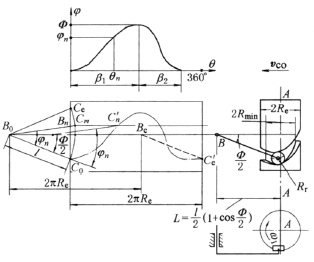 以凸轮理论轮廓(展开图)上的点为圆心、以Rr为半径画一系列滚子圆,作其包络线即得凸轮工作轮廓的展开图。将此图包到凸轮圆柱体上即得凸轮工作轮廓 |