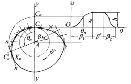 在yy上取C0Cn=sn;又以ACn为起始线,逆凸轮转向量取θn,得C 'n,过C 'n作AC 'n的垂线nn,(即平底在反转后的位置);取不同的θ值,重复上述画法,得一系列直线,作其包络线即是 |