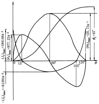 转盘与凸轮在分度期的角速比ω2/ω1 最大角速比(ω2/ω1)max 转盘分度期的角位移fi、角速度ω2、角加速度ε2和角跃度j2与凸轮转角θ的曲线图 |