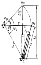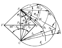 2.如图b作图。选取机架AC=d ,在A、C点作射线AF、AF '、CF 和CF ',使它们与机架AC的夹角小于90°-γp,得交点F、F ',分别以F、F ' 为圆心,CF 和CF '为半径作圆K和K',由于∠AFC=∠AF 'C=2γp,故在K圆的圆弧 3.若选定ρ1、φ12,则以C为圆心,l1=ρ1d 和l2=λl4为半径作圆,并从A 点作摇杆摆角φ12,与两圆弧相交于B1、B2点,同时,使AB1=AB2,则AB2就是所求的摇杆长度r,并得到起始角φ1,若选定ρ1和σ,则从A点以r'=σd为半径作圆交得B'1 点和B'2点,可得到φ'12和φ'1 |