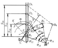 1.任取摇杆轴心A,摇杆长度AB选取的依据是当其夹角为φ23(=φ13-φ12)时,所对的弦长B2B3恰等于S23(=S13-S12)之长 2.由B1点任作直线B1K,与B2B3的延长线相交于E点,取EB2=EF得F点。由于B1K是任取的直线,所以用上法由B1点作不同的直线可得到许多个F点,把这些点连接起来即为曲线 m 3.以B1为圆心,以S12 长为半径画圆与曲线m相交于D2点。连接B1D2,即得摇杆处于AB1位置时油缸轴线的位置 4.在B1D2延长线上截取活塞行程S13和S14,得D3、D4两点。作B3D3与B4D4的中垂线,两者相交于C点,则机构ABC即为所求的机构 |