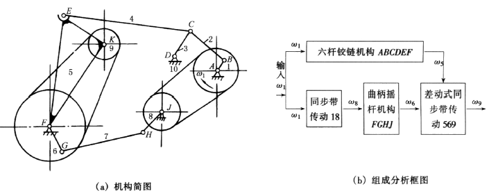 下图a所示为剑杆织机中应用的差动式同步带-连杆组合机构。下表列出了这种组合机构中各构件间的运动关系。 |