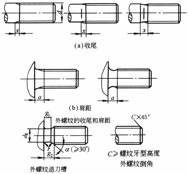 注:1.应优先选用“一般”长度的收尾和肩距;“短”收尾和“短”肩距仅用于结构受限制的螺纹件上;产品等级为B或C级的螺纹紧固件可采用“长”肩距。 2.d为螺纹公称直径代号。 3.dg公差为:h13(d>3mm)、h12(d≤3mm)。 |