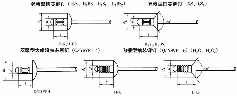 铝合金/钢 H2S d×l、H2S2 d×l 铝合金/不锈钢 H2BS d×l、H2BS2 d×l 钢/钢 GS d×l GS2 d×l 双鼓型大帽沿抽芯铆钉