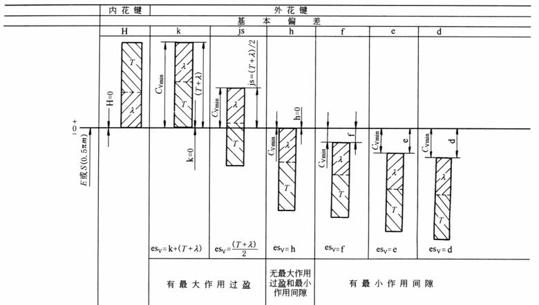 注:1.花键齿侧配合的性质取决于最小作用侧隙。本标准规定花键联接有6种齿侧配合类别(见:H/k、H/js、H/h、H/f、H/e和H/d。对45°标准压力角的花键联接,应优先选用H/k、H/h和H/f。 2.渐开线花键联接的齿侧配合采用基孔制,即仅用改变外花键作用齿厚上偏差的方法实现不同的配合。 3.在渐开线花键联接中,键齿侧面既起驱动作用,又有自动定心作用,在结构设计时应考虑到这一特点。 4.当内、外花键对其安装基准有同轴度误差时,将影响花键齿侧的最小作用间隙,因此应适当调整齿侧配合类别予以补偿。 5.允许不同公差等级的内、外花键相互配合。 6.齿距累积误差、齿形误差和齿向误差都会减小作用间隙或增大作用过盈。 |