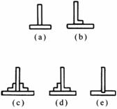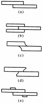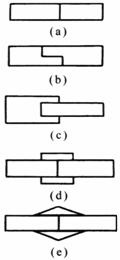 图a粘接面积小,除拉力外,任何方向的力都容易形成不均匀扯离力而造成应力集中,粘接强度低,一般不采用 图b为双对接,明显增加胶接面积,对受压有利 图c为插接形式,承受弯曲应力有利 图d为加盖板对接,受力性能较图a大有提高 图e为加三角盖板对接,可改善图d由于截面突变而产生应力急剧变化 |