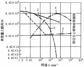 1—无润滑轴承;2—滚动轴承;3—含油轴承;4—液体动压轴承; 5—空气静压轴承;○—最大允许转速 |