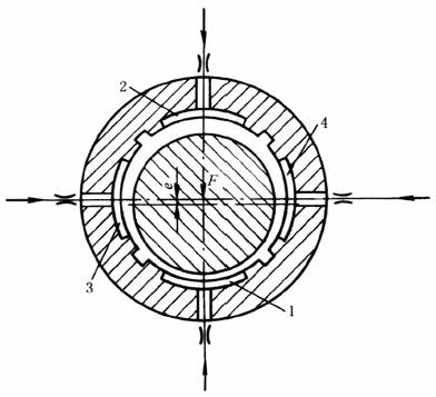 从供油系统供给具有一定压力的润滑油,通过各个小孔节流器(或毛细管节流器),进入相应的轴承油腔内。空载时由于各油腔对称等面积分布,各个节流器的节流阻力相同,使轴浮起在轴承的中心位置(忽略轴自重)。此时,轴承封油面各处的间隙(h0)相同,轴承各油腔内的压力(p0)相等。当轴受载荷 F 后,轴向下产生微小的位移 e,使油腔1处的间隙减小到(h0-e),油流阻力增大,油腔2处的间隙增大到(h0+e),油流阻力减小,因而油腔1的压力 p1 升高,油腔2的压力 p2 降低。所以油腔1、油腔2便形成压力差Δp(Δp=p1-p2)。当AeΔp(Ae为轴承一个油腔的有效承载面积)同载荷 F 平衡,即F=AeΔp时,轴便不再往下移动,处于平衡状态。选择合理的轴承和节流器参数,能使轴产生的位移,满足设计要求。如果载荷不是正对油腔,可将载荷分解为垂直方向和水平方向的载荷,分别由上下油腔和左右油腔的AeΔp与之平衡,故四个油腔的轴承已能承受来自任意方向的径向载荷 |