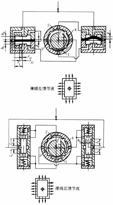 从供油系统供给具有一定压力的润滑油,通过滑阀反馈节流器(或双面薄膜反馈节流器),进入相应的轴承油箱内。空载时,由于各个油腔对称等面积分布,滑阀在两端弹簧作用下处于中间位置(或薄膜处于平直状态),各个节流器的节流阻力相同,使轴浮起在轴承的中心位置(忽略轴自重),此时轴承封油面各处的间隙 h0 相同,轴承各油腔内的压力 p0 相等。当轴受载荷 F 后,轴向下产生微小的位移 e,使油腔1处的间隙减小,油流阻力增大,因而油腔1的压力 p1 升高;油腔2处的间隙增大,油流阻力减小,因而油腔2处的压力 p2 降低,由于油腔1、油腔2分别与滑阀两端连接(或与薄膜两面的上下油腔连接),滑阀两端面(或薄膜上下两面)受p1、p2作用后,使滑阀向上移动x(或薄膜向上凸起变形量 如果轴承和节流器的参数选择合理,在某个载荷 F 作用下(例如额定载荷),完全有可能使轴回到原来(F=0)的中心位置,处于平衡状态。当F不断增加、滑阀便相应地向上移动(或薄膜相应地向上变形),直至下边节流口完全打开,上边节流口完全封闭(或薄膜同圆面接触),此时,滑阀移到最上的极限位置,(或薄膜变形到最大限度)。此后,如果 F 再继续增加,滑阀(或薄膜)不再起控制作用 轴在载荷F作用下产生的位移e有三种不同状态: (1)轴位移e的方向与载荷F的方向相同,e 为正值,称为轴承的正位移 (2)轴在某个载荷F作用下(例如额定载荷)产生的位移 e,由于滑阀(或薄膜)的反馈作用,使轴回到原来(F=0)的中心位置(e=0),处于平衡状态,e 为零,称为轴承的零位移 (3)轴在载荷 F 作用下产生的位移 e,由于滑阀(或薄膜)的反馈作用,使轴回到原来(F=0)中心位置的上方,处于平衡状态,轴位移 e 的方向与载荷 F 的方向相反,e 为负值,称为轴承的负位移 |