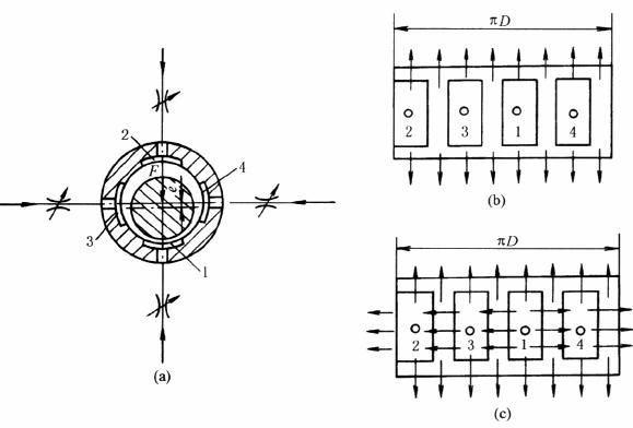 这种轴承的特点是没有周向回油槽,如图 a 所示。空载时,压力油经过节流器分别进入四个油腔,轴在四个互相对称的油腔的AeΔp作用下处于中心位置,(忽略轴自重)。这时,油经轴承间隙从轴承端面流出,如图 b 所示,其工作原理大体与有周向回油的液体静压轴承相同。但是,受载后,由于各油腔压力发生了变化,使得各油腔中的油除了通过间隙从轴承端面流出外,压力较高的油腔中的油向着压力较低的油腔流动,如图 c 所示,这种流动称为内流 |