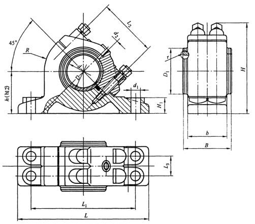 适于环境温度-20~80℃的工作条件。 标记示例:d=80mm的对开式四螺柱斜滑动轴承座:HX080 轴承座 JB/T 2563-2007