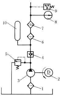 1—粗过滤器,用铜丝布制成;2—电机;3—油泵;4—单向阀;5—溢流阀;6—粗过滤器,可用线隙式滤油器;7—精滤油器,用纸质过滤器等;8—压力表;9—压力继电器,用以保证轴承中的油液在建立一定压力后,才能起动轴;10—蓄能器 |