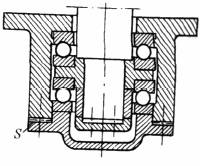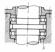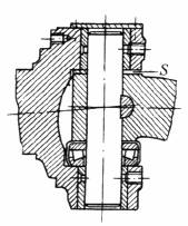 通常也用装有垫片S的固定盖进行游隙调整。推力球轴承最好装在立轴上,因为这样钢球保持架能与套圈保持相对同心 |