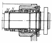 工作温度随游隙的减少而上升。因此安装时要找出游隙与温度的最佳配合关系。用螺母M将圆柱滚子轴承的内圈紧固于锥形轴颈上,从而减小其径向游隙;同时用螺母N将推力轴承组调整至无游隙。配置在二推力轴承之间的弹簧可使因工作压力而卸载的轴承保持要求的预过盈 |
