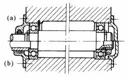 左端为固定支点,右端为浮动支点。结构简单,拧紧轴承盖时轴承不会被压紧。(a)型箱体为通孔,便于加工,(b)型可承受稍大的轴向力。本结构用以承受径向力和不大的轴向力。广泛用于各种机械 当右端使用圆柱滚子轴承时,其外圈也应做轴向固定 |