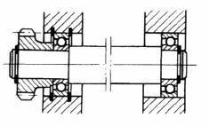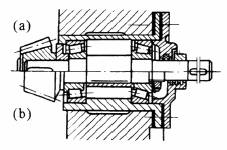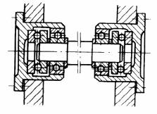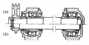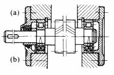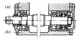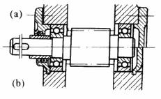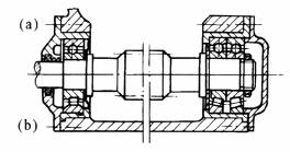 采用自动调心型轴承,适用于两轴承座不同轴度较大,轴的刚性较小的场合。左端为固定支点,右端为游动支点。(a)型能承受较大的轴向力,(b)型装在光轴上,便于调整轴向尺寸,但不能用于轴向力较大的场合(图中所有轴承座为对开式) |