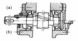 (a)型用轴承盖与箱体间的垫片,(b)型用螺钉和压盖调整轴向间隙或预紧。结构简单,装拆简便,箱体为通孔,加工容易,能同时承受径向力和较大的轴向力 |