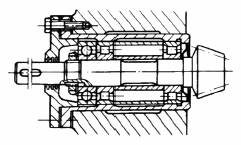 车床主轴的一种典型结构。为增加轴的刚性,采用三点支撑,右端为固定支点,其余两支点皆可游动。用两个单向推力球轴承承受轴向力,用套筒压紧带锥孔的双列圆柱滚子轴承,并以此来调整径向游隙。右端有退卸套,便于拆卸。此结构能承受较大的径向和轴向力且精度较高 |