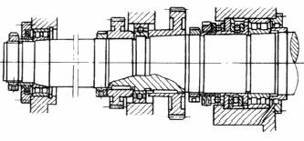 用对称安装的两个单向推力球轴承承受轴向力,用套筒与箱体间的垫片调整轴向间隙。当采用圆柱滚子轴承时,应注意外圈的轴向固定问题 |